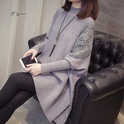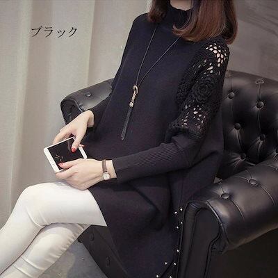セーター ニット 長袖 ロング丈 ドルマンスリーブ レディース トップス チュニック ハイネック 透かし彫り アウター サイドスリット デザイン袖 ゆったり デザイン ファッション お洒落 コーデ カ