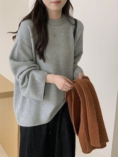 セーター グルーネック レディース ニットセーター ショート丈 長袖 無地 ニット 無地セーター ニットソー インナー アウター 秋冬 ニットトップス プルオーバー トップス ゆったり レイヤード 防