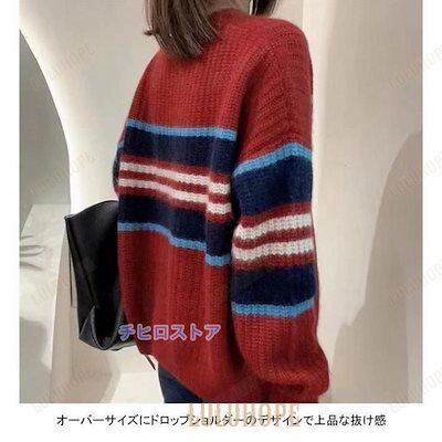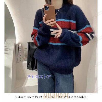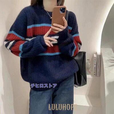 ニットセーター 長袖 セーター レディース ニット クルーネック ソフト ボーダー柄 プルオーバー 厚手 トップス アウター おしゃれ シンプル ゆったり