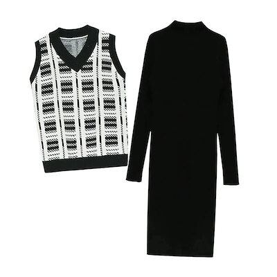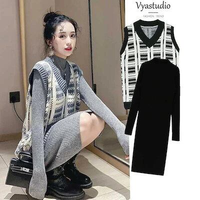 セーターニット2点セット スカート+ベスト レディース Vネック ラウンドネック ニットワンピ ゆっ