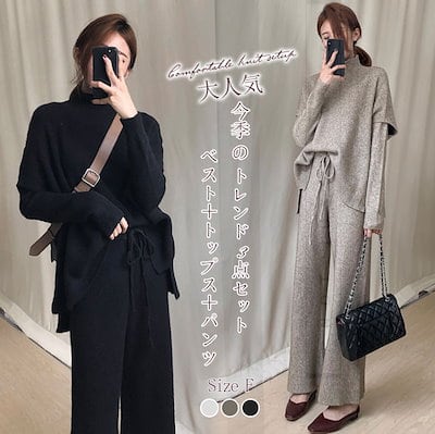 セットアップ レディース 秋冬 ニット セットアップ 3点セット ニットセーター プルオーバー ワイドパンツ ニットセット パンツスーツ ニットセット セーター ベスト カジュアル 通勤 OL 体型カ