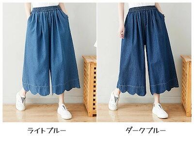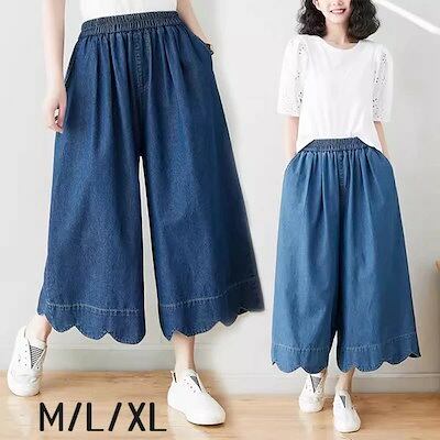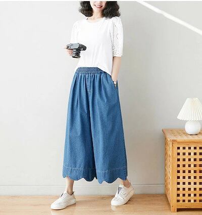 フレアガウチョパンツ ワイドパンツ ゆったり カジュアル 九分丈 ウエストゴム レディース 大きいサイズ 春 夏 30代 40代 50代 母の日 ギフト ブルー M L XL cm108t2t2c6