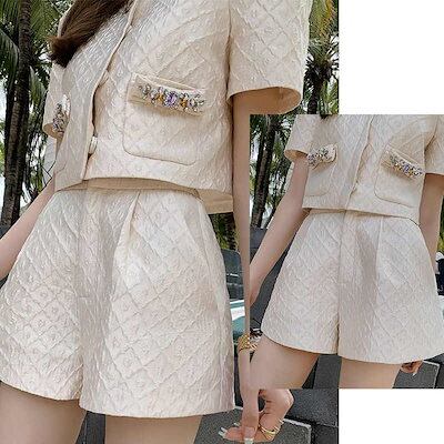レディース ビジューポケット ジャガードクロップドジャケット フレアショートパンツ セットアップ ショートパンツ ボリューム袖 夏 シンプル 大きいサイズ おしゃれ 大人カジュアル フェミニン かわい