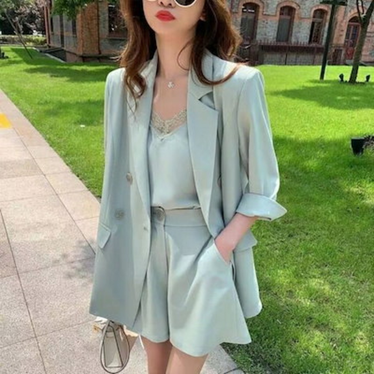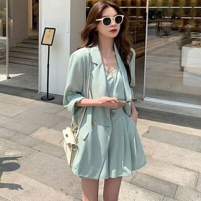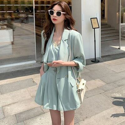 セットアップ 3点セット ジャケット レディースウエストゴム ショートパンツ レース フレア キャミソール 上品 ピンク グリーン 大人可愛い OL ママ きれいめ 仕事 通勤