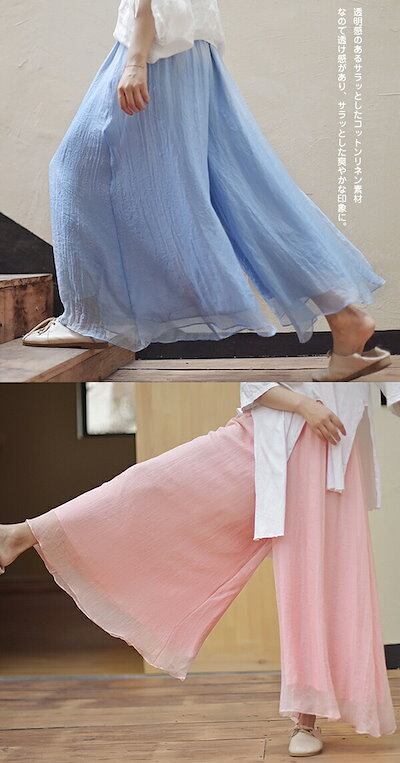 スカンツ レディース スカーチョ ロング丈 ワイドパンツ リネン混紡 ガウチョパンツ ロングパンツ ウエストゴムト フレアパンツ ハイウエスト ロングスカンツ ボトムス エスニック風 レトロ さらっと