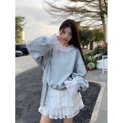 2024 秋冬 トップス 長袖 かわいいラウンドネック Tシャツ レディース 韓国風 ルーズ ゆったり 無地 カジュアル おしゃれサイズルーズプルスリーブ シルエットファッション系シャツ衣装フレンチ
