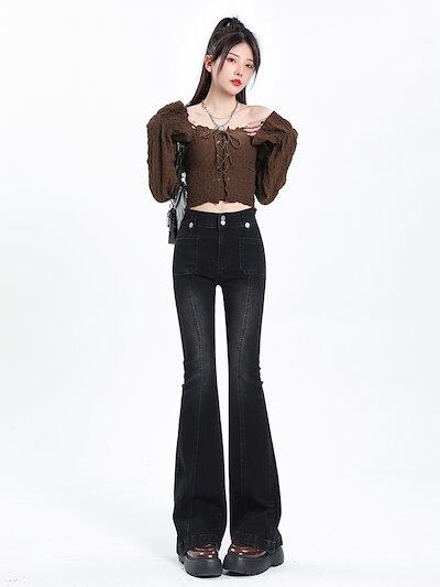 レトロvibeジョイントフレアジーンズレディース春秋新作ライトカラーハイウエストスリムchicマイクロフレアパンツins