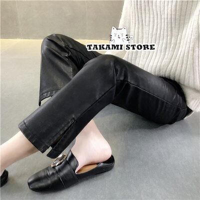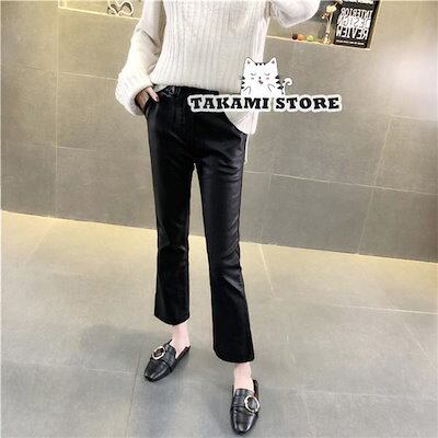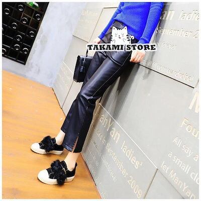人気商品超目玉 レザースパンツ レディース ガウチョパンツ スリット ウエストゴム PU 九分丈 フレア ハイウエスト 合皮 フェイクレザー 革パン 美脚 秋 冬