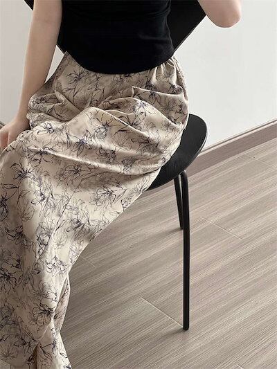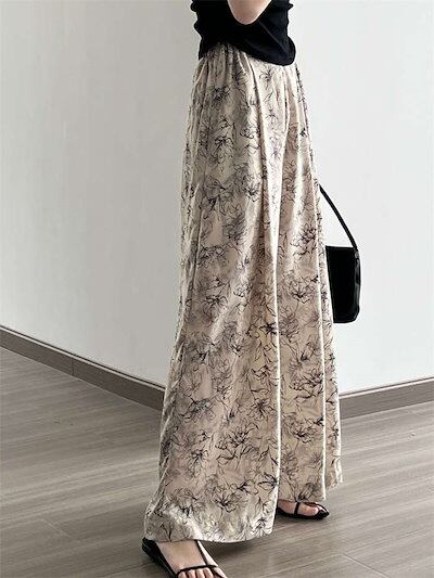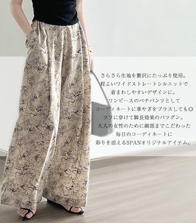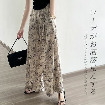 ワイドパンツ レディース 春 夏 パンツ 裏地付き ガウチョパンツ スカーチョ ボタニカル柄 総柄 花柄 マキシ丈 ロング丈 フレアパンツ イージーパンツ プリント フラワー ウエストゴム ゆったり
