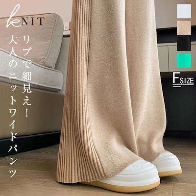 ワイドパンツ レディース ボトムス 秋 冬 パンツ ニット ニットパンツ リブニット ガウチョパンツ フレアパンツ ロング ロング丈 ワイド リブデザイン リブ 長ズボン スカーチョ ハイウエスト ゆ