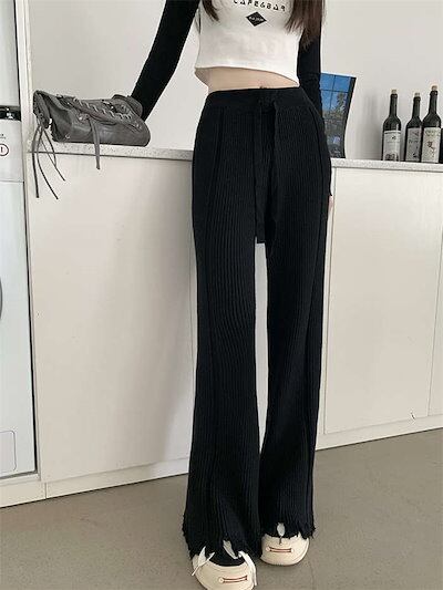 ワイドパンツ レディース パンツ ボトムス ニット ニットパンツ 裾フリンジ 秋 冬 ロング ロングパンツ 長ズボン ウエストゴム フレアパンツ 秋冬 あったか 大人 おしゃれ 無地 美脚 あったか