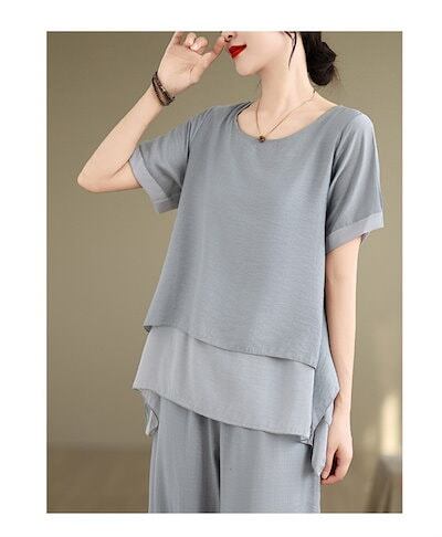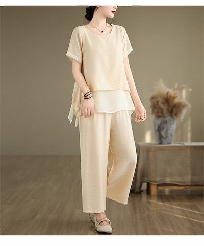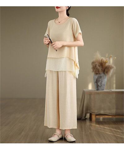 セットアップ 夏 レディース 綿麻風 2点セット フレア 上下セット チュニック Tシャツ& ワイドパンツ 半袖 バギーパンツ イージー フレアパンツ 涼しい カジュアル ナチュラル 大きいサイ