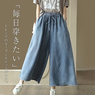 デニム パンツ レディース ワイドパンツ ひんやり ボトムス デニムパンツ 春 夏 ワイド ルーズ フレアパンツ ジーンズ ジーパン 体型カバー ズボン ゆったり ゴム 9分丈 ストレート 楽ちん 無