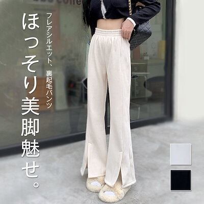 フレアパンツ 防寒 カジュアル レディース フェミニン ベージュ ボトムス パンツ シンプル ズボン フロントスリット 着回し ロング きれいめ 裏ボア 秋冬 暖か 着?せ 裏起毛 おしゃれ ウエスト