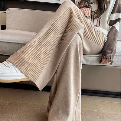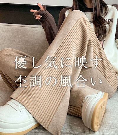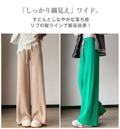 パンツ ワイドパンツ ニット 脚長効果 ロング丈 ゆったり スカーチョ 長ズボン リブニット ボトムス ガウチョパンツ ワイド ロング リブ ニットパンツ リブデザイン フレアパンツ 秋 レディース
