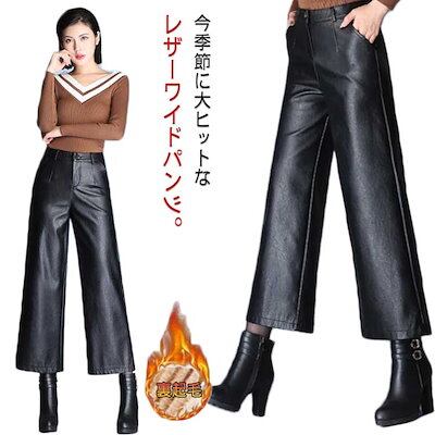 ガウチョパンツ レザーパンツ ハイウェスト 裏起毛 九分丈 ボトムス ロングパンツ フレアパンツ 皮パンツ 革パンツ 美脚 レディースパンツ ワイドパンツ 体型カバー おしゃれ 秋冬 OL 通勤 20