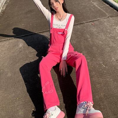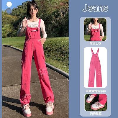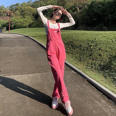 韓国 コーデ完成 ピンクデニムサロペット 2024春新作薄手で痩せ見え サロペット オールインワン レディース ワイドパンツ サロペットパンツ