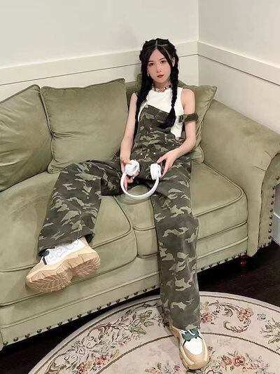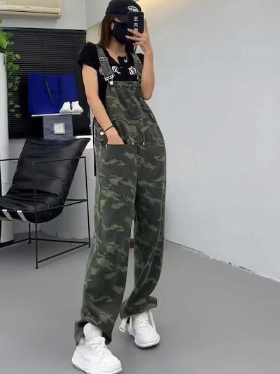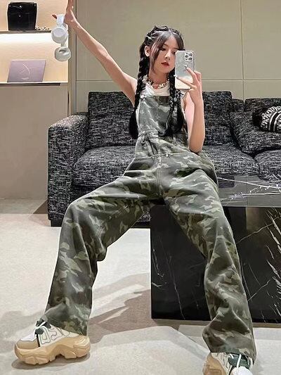 韓国 迷彩ストラップジーンズ 夏の2024新型スリムなワイドパンツ コーデ完成 サロペット オールインワン レディース ワイドパンツ サロペットパンツ