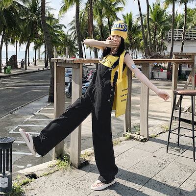 春 夏 人気なオールインワン 裾スリット パンツ ワイドパンツ スクエアネック 大人 ロング丈 オーバーオール レディース 体型カバー サロペット