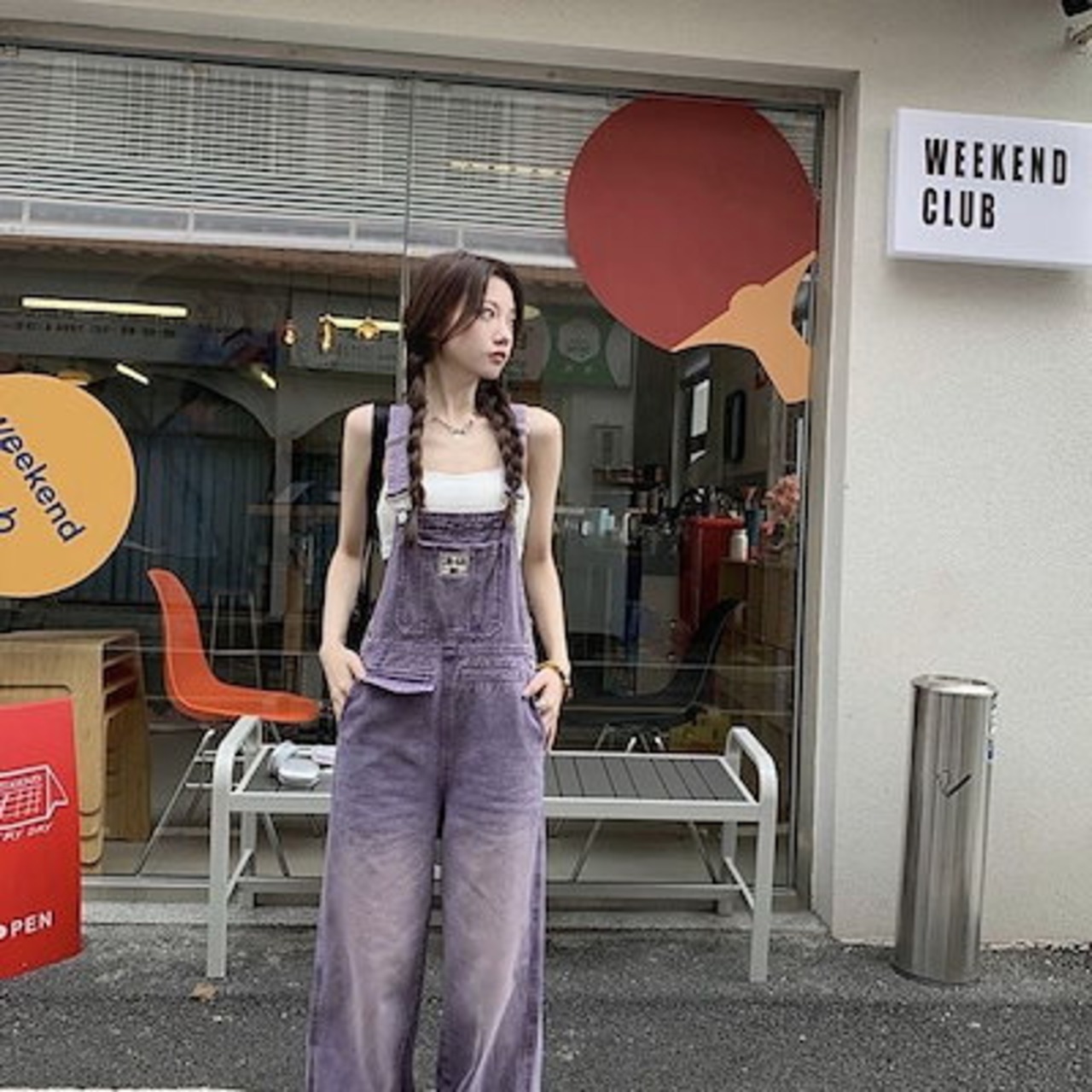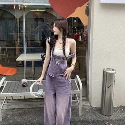 レトロ パープル オーバーオール デニムオーバーオール レディース 春 新作 ゆったり ワイドパンツ ハイウエスト サロペット