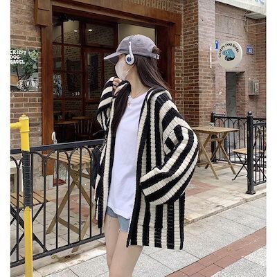 ニットカーディガン 秋冬新作 カーディガン ストライプフード付きニットアウター 百掛け レディース ゆったり 韓国ファッション パーカー 怠惰な風 大きいサイズ体型カバー?トップスセーター
