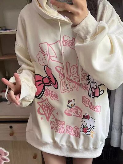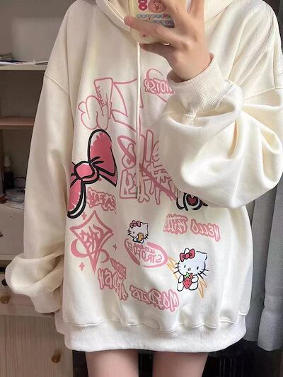【shanghaihengq】パーカー レディース キティ ハローキティ 可愛い フード付き スウェット 薄手裏起毛 プルオーバー トレーナー 大きいサイズ 秋冬 トップス 韓国ファッション
