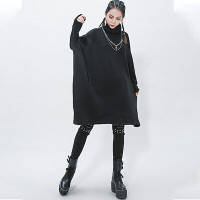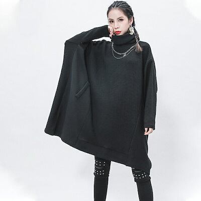 ドルマンニットニットレディースニットワンピースモードトップス長袖セーターハイネックタートルネックプルオーバーきれいめ春ブラック大きいサイズゆったり体型カバーとらみ