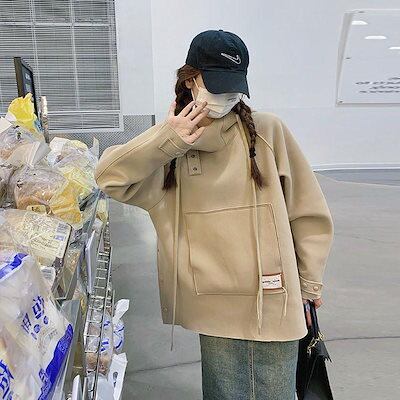 新作 パーカー レディース プルオーバー フード付き 長袖 ハイネック アウター スリット ゆったり カジュアル 春秋 通勤 韓国風 上品 おしゃれ