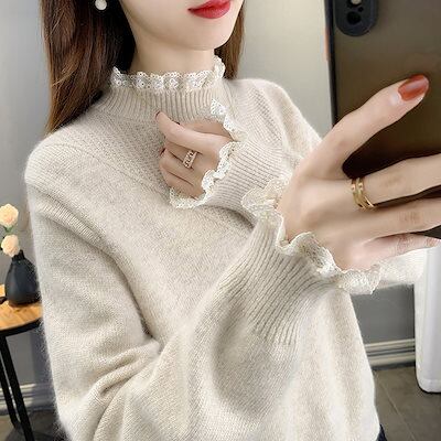 人気なリブニット ベーシックニット 秋冬ファッション ニット レースパッチワーク ハイネックセーター レディース トップス 百掛け暖かい タートルネックカシミヤタッチ