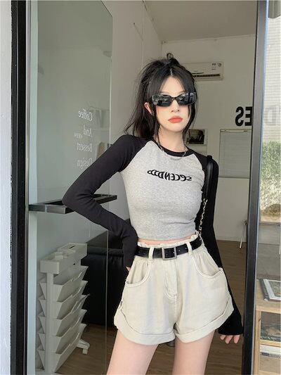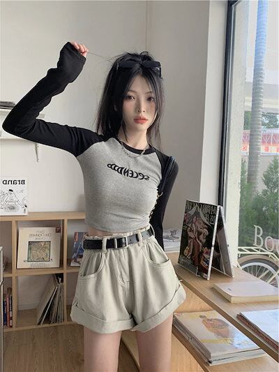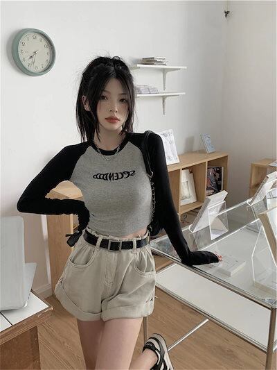 2024夏 韓国 トップス 長袖 可愛い おしゃれ タイトフィット カットソー ラウンドカラー 重ね着丈 スリーブ 女っぽ レディース Tファッション系 フェミニン きれいめ 色っぽ プリント