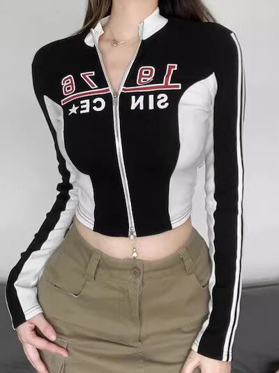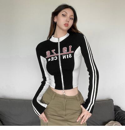 2024秋 長袖 Tシャツ ショート丈 カットソーワッペンK-POPトップス カジュアル 配色韓国系ストリートへそ出しタイトネックスリーブダブル肌見せ T ファッションレディースかわいいサイド衣装風冬