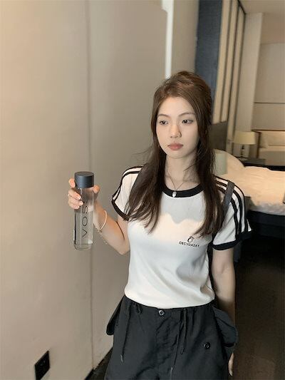 2024 春夏トップス 大人可愛い風半袖 Tシャツ 韓国 ラウンドネックロゴスリム かわいいへそ出し ショートおしゃれスリーブカジュアルサイドコーデ丈ファッション系レディースストリートお出かけ T