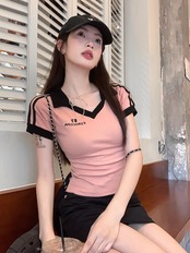2024 春夏トップス 大人可愛い半袖 Tシャツ 韓国 ラウンドネックロゴスリム かわいいへそ出し ショート おしゃれスリーブ カジュアルサイドコーデ丈 ファッション系レディースストリートお出かけ T
