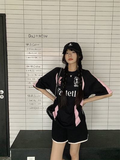 2024 夏 韓国 甘い 可愛い風トップス Tシャツ ファッション系半袖スリムフィットサイドペイントシルエットゆったり丈 休日レディースサイズ韓国Vネック おしゃれカジュアルメンズライク T