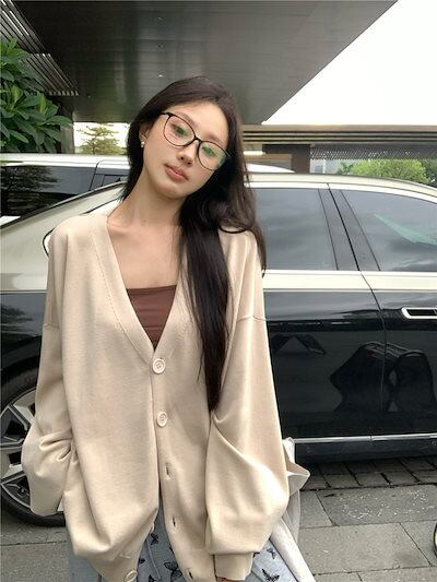 2024 夏トップス カーディガン 長袖 ボタン Vネックゆったり 大きめサイズ 丈長め 細見え 夏 赤 レッド おしゃれ かわいい 韓国ファッション レディース お出かけ