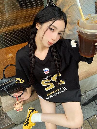 2024 夏 韓国可愛い風トップス Tシャツ ファッション 半袖 スリムフィット サイドペイントシルエットゆったり丈 休日レディースサイズ韓国Vネック おしゃれ カジュアル メンズライクフットシャツ
